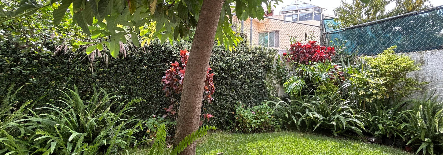 • Patio trasero con jardín, terraza techada o posibilidad de hacerlo, para área social al aire libre.